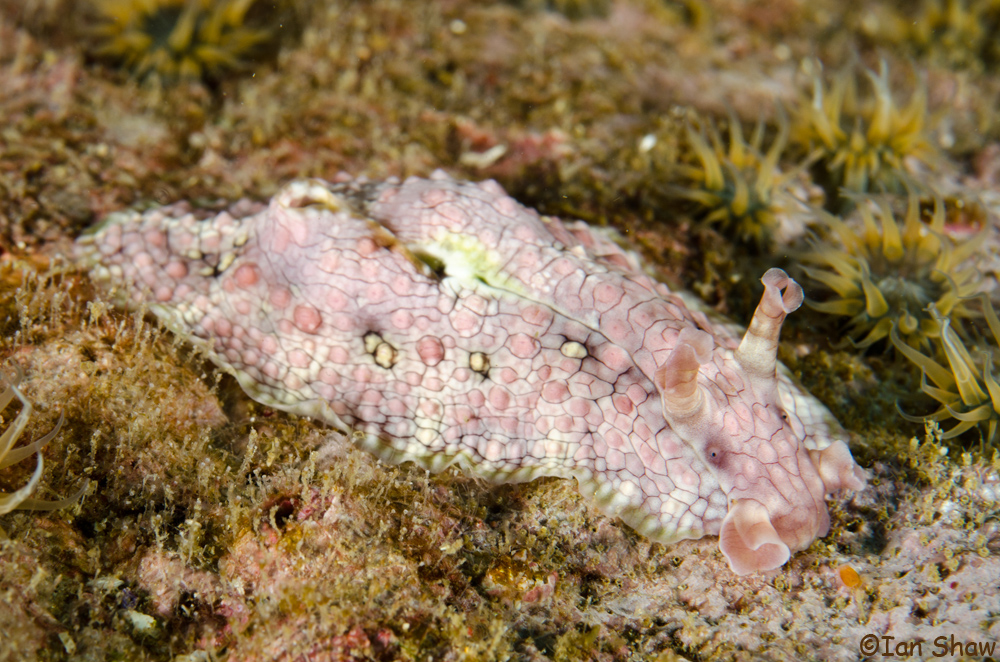 Additional Notes: A large, flattened species, firm to the touch, colour variable but usually mottled and ranging from a pale yellow to a dark brown. The foot has a distinct green edge. The dorsal surface has extendable, compound, pointed papillae. The head has two pairs of enrolled tentacles, the anterior pair are both chemosensory and tactile, used to ‘smell’ chemicals in the water, and to feel objects. The pair behind the eyes, the rhinophores, are the main chemosensory organs, used for ‘smelling’ food. Emits a white fluid when disturbed. Grows to about 15 cm.