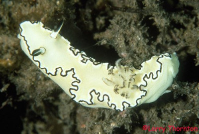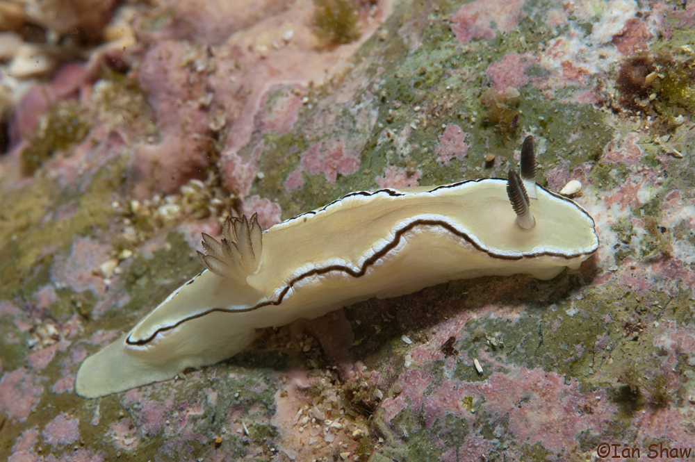 Additional Notes: Black mantle margins, black border around rhinophore pockets and black rhinophore clubs. Colour may vary from creamy white to pale mustard brown. New South Wales specimens are predominantly white in colour. Grows to 60 mm.