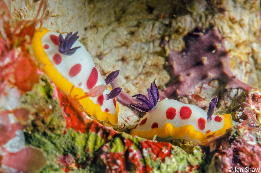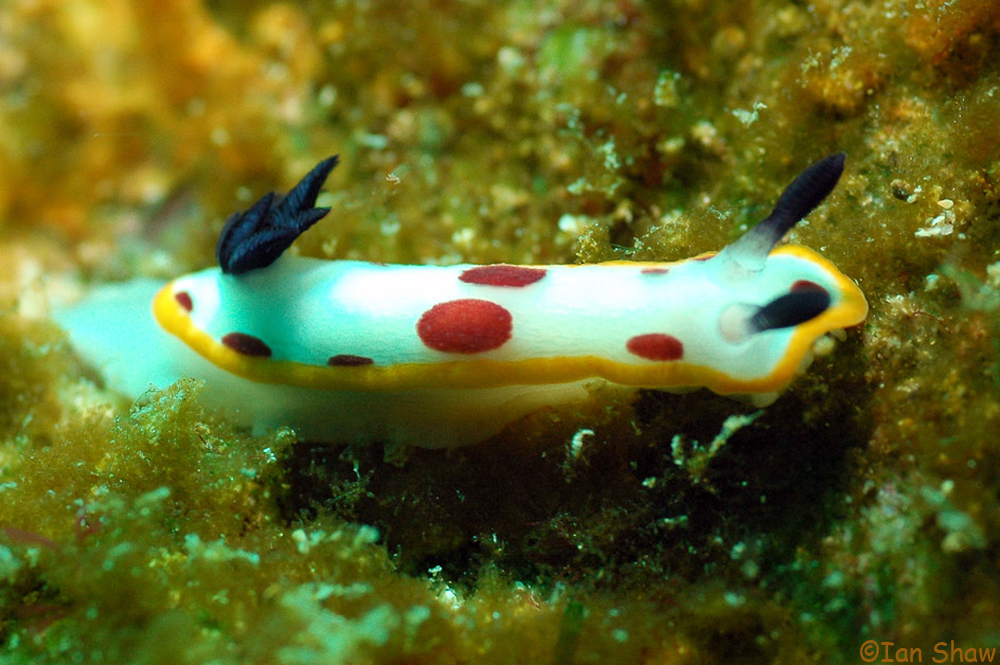 Additional Notes: Specimens photographed here considered to be a regional spotted colour variation of G. fidelis known to range only from northern New South Wales to the southern end of the Great Barrier Reef. Number and size of red spots is extremely variable, but the spots are always symmetrical. The black gills and rhinophores distinguish this species from Goniobranchus splendidus. Grows to 25 mm.