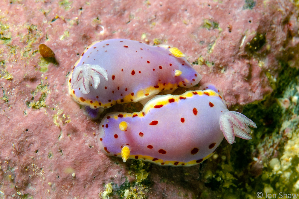 Additional Notes: Pinkish blue body with red dots and mantle with white margin with yellow submarginal band which does not continue around the front of the mantle. Yellow rhinophores, translucent gills with pinkish blue edging. Similar Hypselodoris bennetti is more blue in colour, has no white mantle margin, and has translucent gills and rhinophores of similar colour.