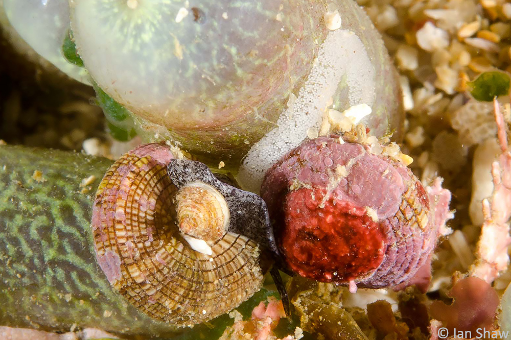 Additional Notes: Note conical operculum and newly deposited egg mass on food source zoanthid, Zoanthus robustus. Grows to around 14 mm shell width.