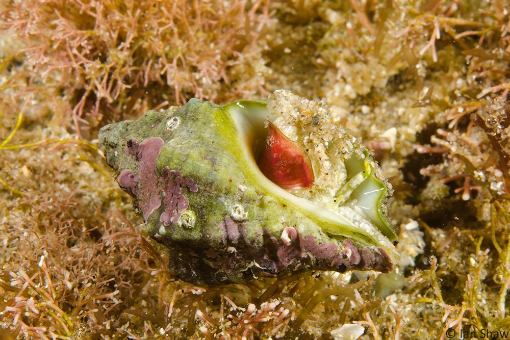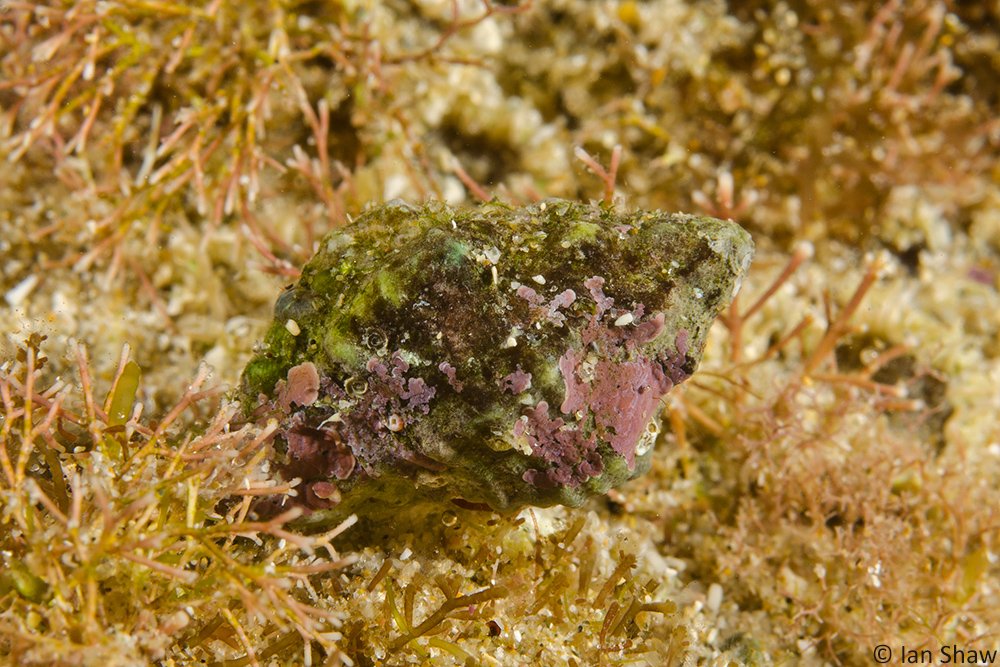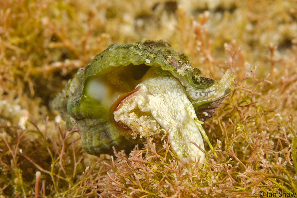 Additional Notes: Whorls rounded and sculptured with broad, rounded, oblique axial ribs. Shell colour white but usually severely eroded. Animal is bright green in colour. Members of this family are carnivorous, feeding on other gastropods, bivalves and barnacles. Considered a pest in bivalve aquaculture. Specimen photographed approximately 20 mm in length, grows to 25 mm.