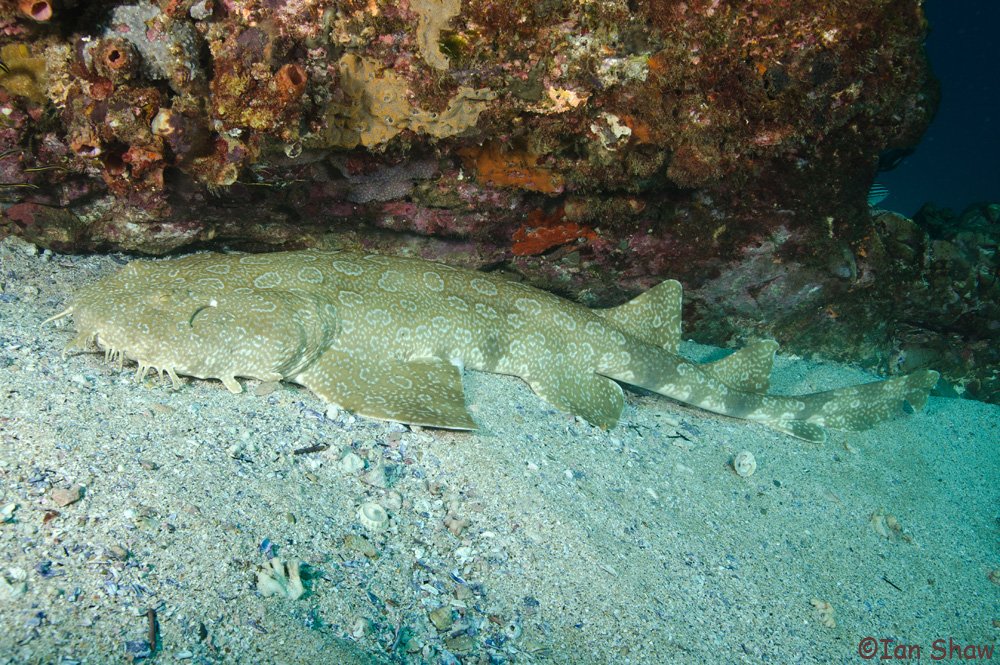 Additional Notes: Dorsal surface dark with multiple darker bands, with numerous white edged circular markings and smaller white spots. Similar O. halei and O. ornatus are generally more brown and have black edged lighter patches. Nocturnal species not often seen in mid water. Feed on bottom invertebrates including crabs, lobsters, octopuses and bony fishes. While not normally dangerous, will bite if harassed or disturbed. Grows to 3 m.