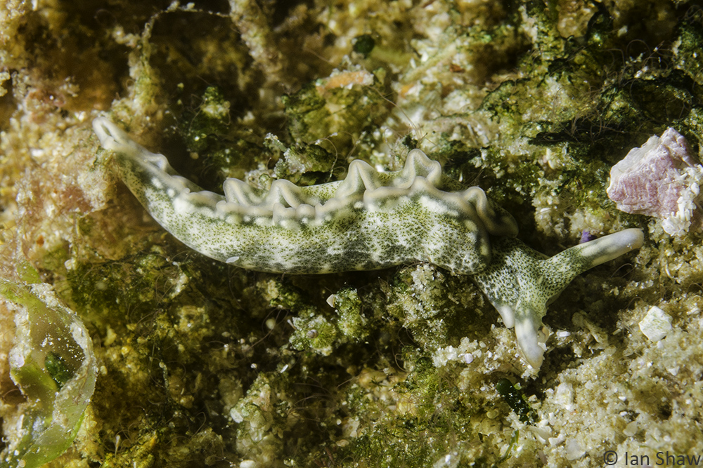 Additional Notes: Cream body with clusters of dark green marks, cream rhinophores with green pattern at the base and with brownish tips. Plakobranchids are small opistobranchs, without shells, but with prominent rhinophores, elongate bodies and wing-like parapodia (a side lobe that extends outwards from the foot). Grows to at least 21 mm.